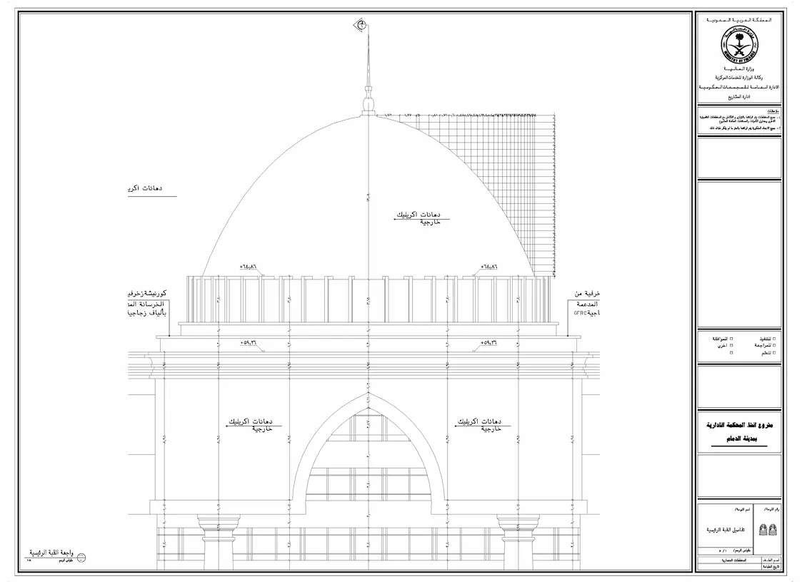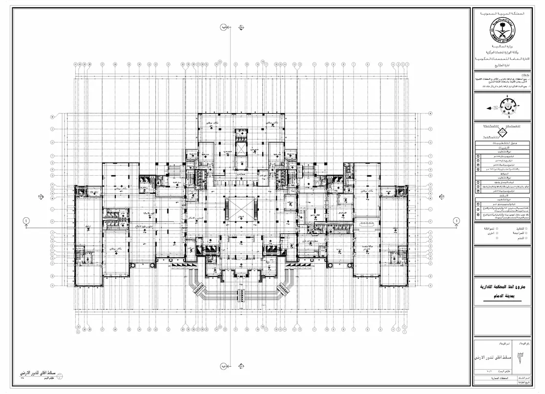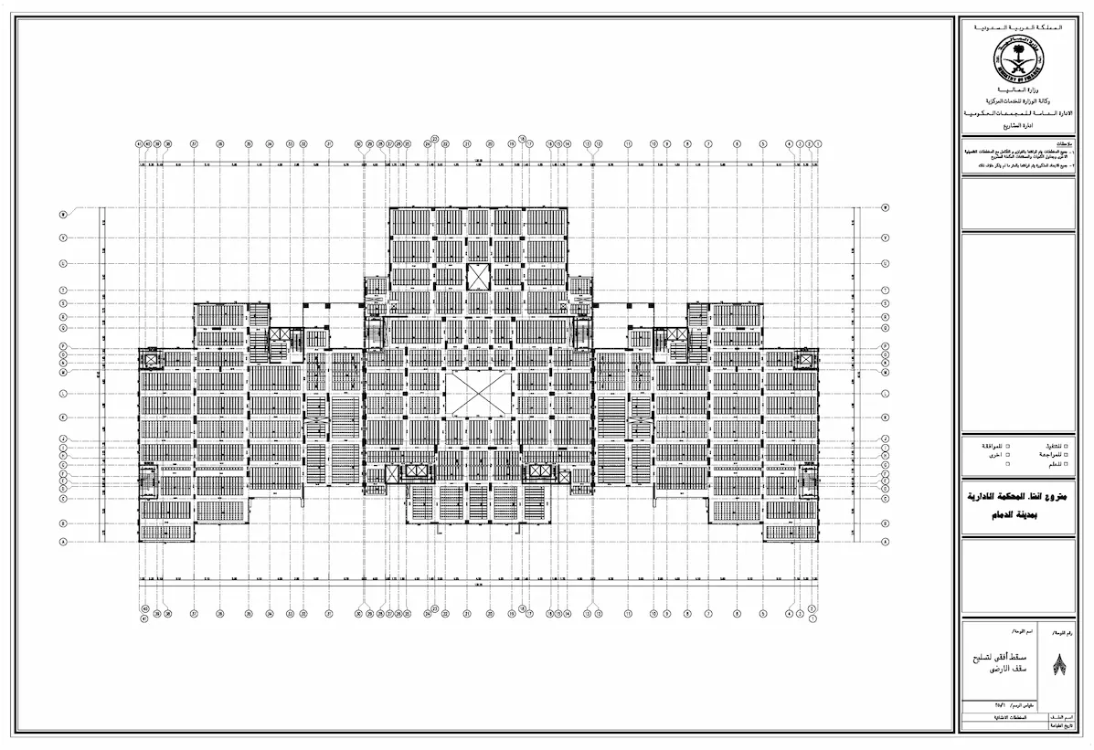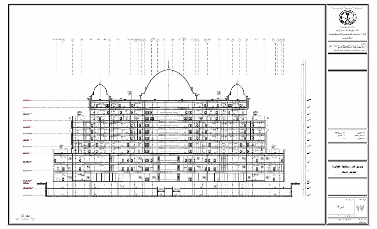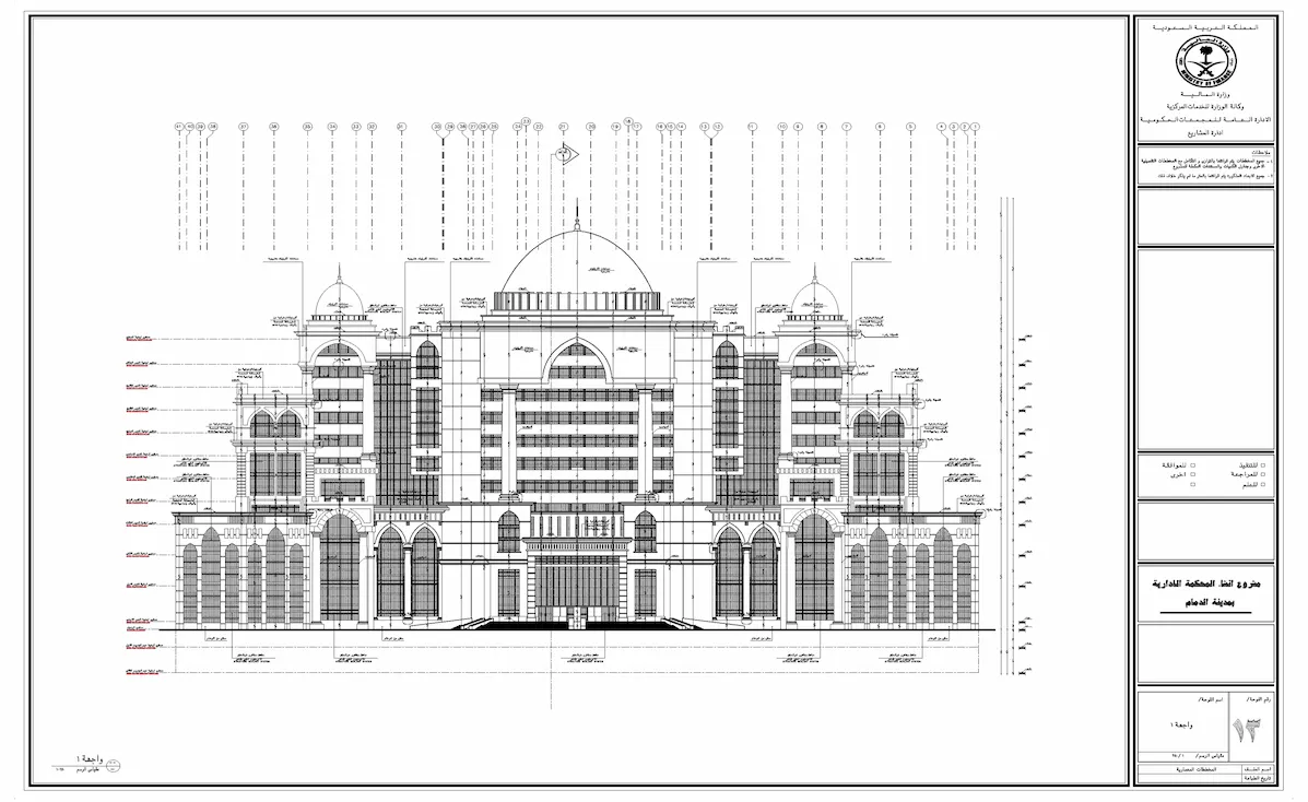 مخططات تنفيذية للمحاكم الإدارية تشمل الأعمال المعمارية والإنشائية والكهربائية والميكانيكية وخدمات حصر الكميات.