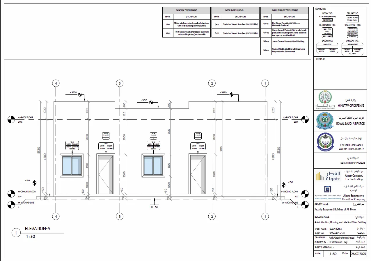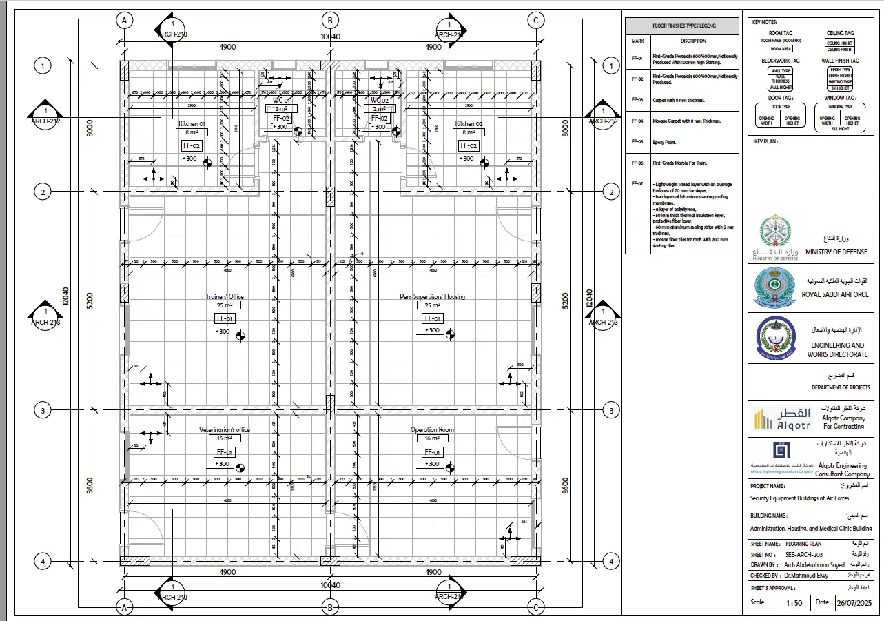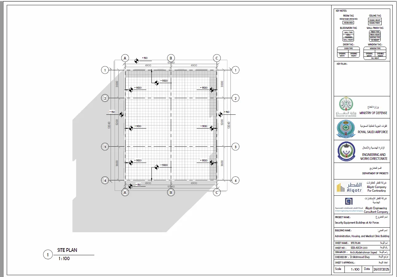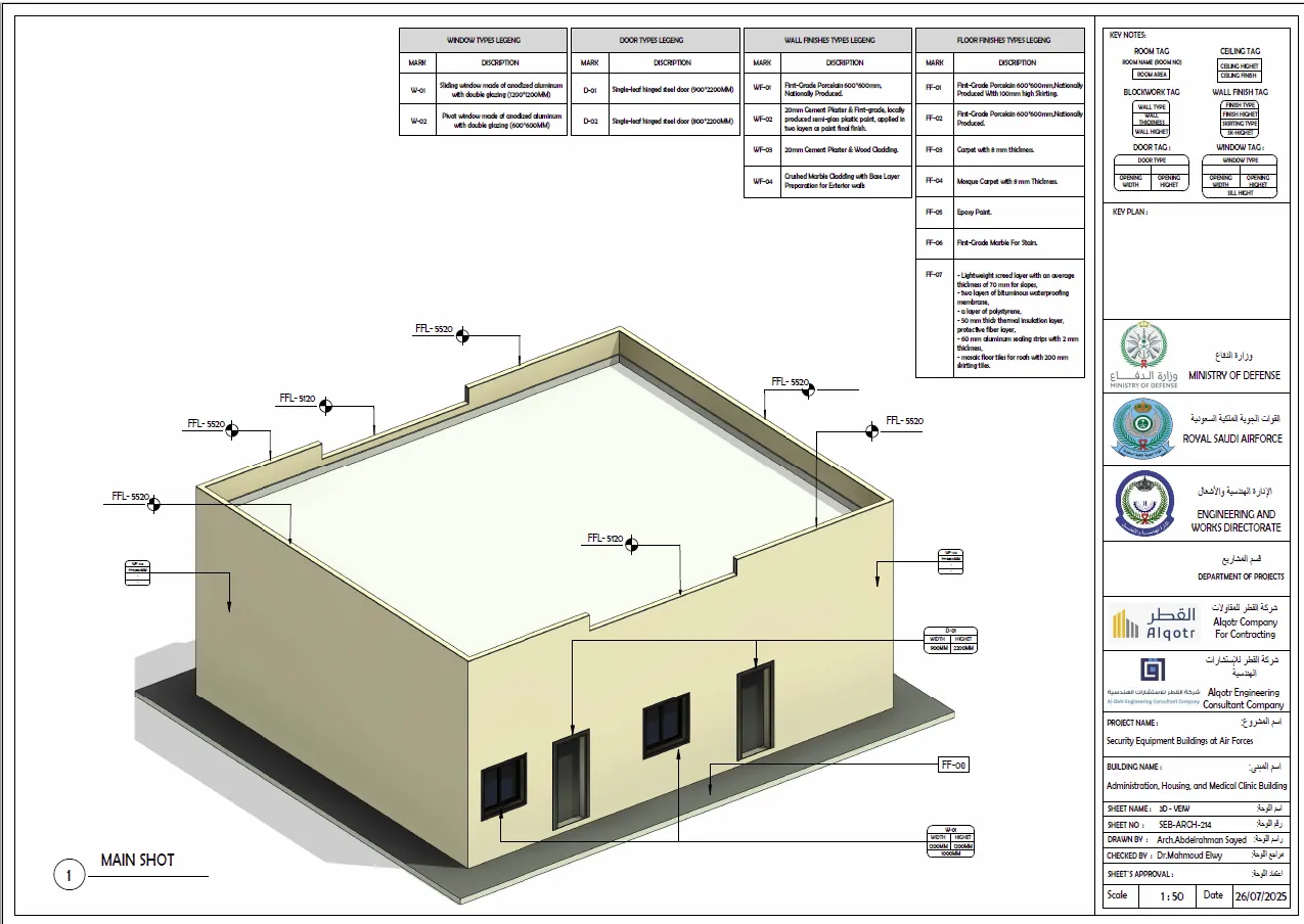 مخططات تنفيذية لمباني المعدات الأمنية في القوات الجوية تشمل الأعمال المعمارية والإنشائية والكهربائية والميكانيكية وخدمات حصر الكميات.
