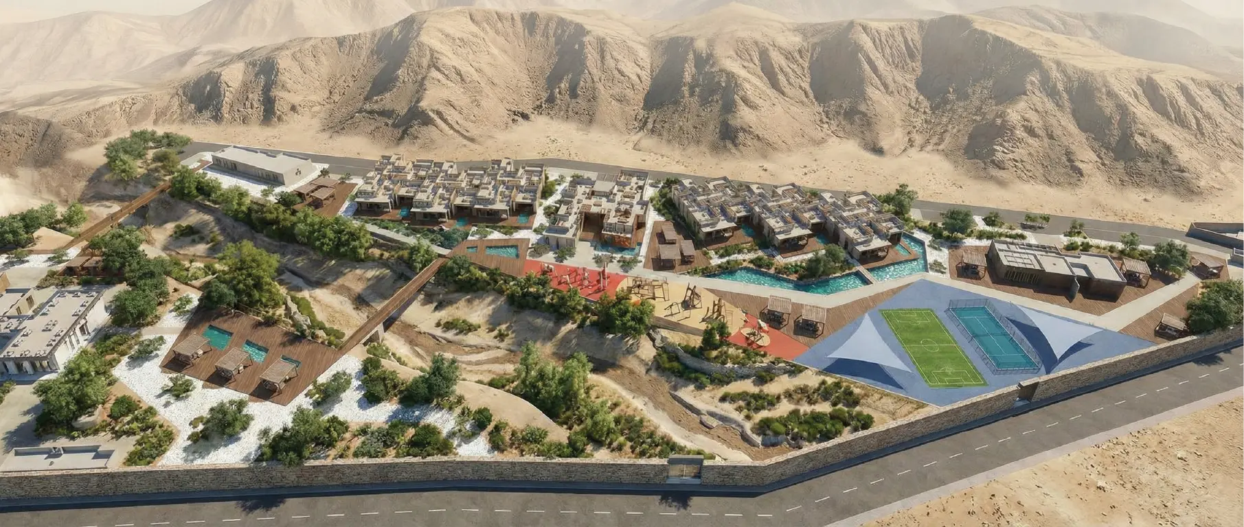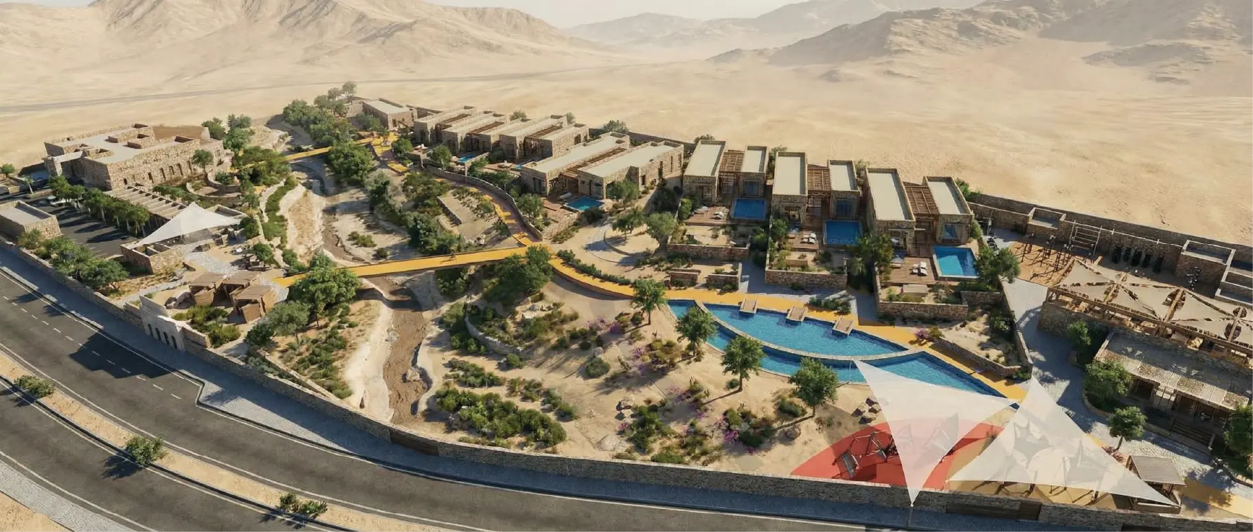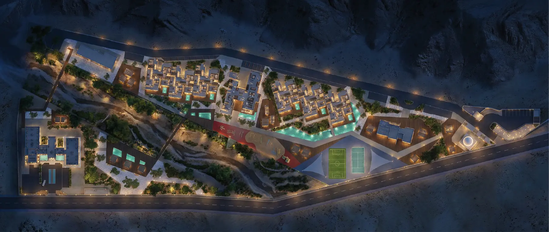 كما تم تصميم المساحات المفتوحة لتوفير تجربة استخدام مريحة وجاذبة، من خلال دمج مناطق جلوس ومنصات مشاهدة وعناصر مائية هادئة ومسارات مظللة تربط بين الفلل والمرافق المختلفة، إضافة إلى مناطق ترفيهية ورياضية مدمجة ضمن البيئة الطبيعية.