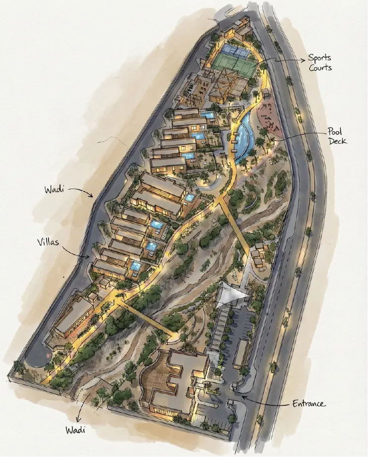 وقد ركز المخطط العام للمشروع على إبراز الخصائص الطبيعية للموقع من خلال إعادة تشكيل مجرى وادٍ جاف وتطوير مسارات مشاة متدرجة واستخدام نباتات محلية تقلل من استهلاك المياه وتعزز الاستدامة البيئية.