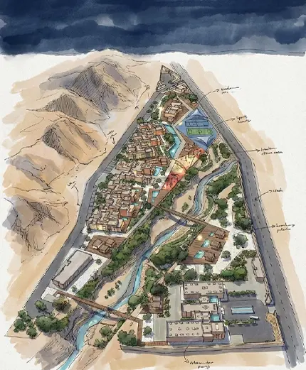ويعكس التصميم رؤية عمرانية قائمة على الهوية المحلية والتخطيط المتمحور حول الإنسان، حيث أصبحت العناصر الطبيعية جزءًا أساسيًا من تجربة الحياة اليومية للسكان.